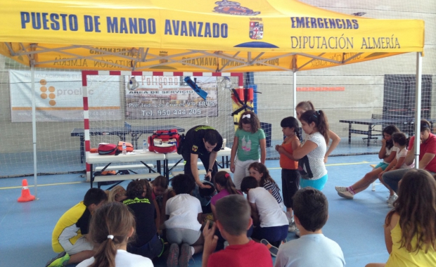 La Agrupación Provincial de Protección Civil ha realizado unas jornadas de autoprotección en caso de terremotos en el municipio de Fines. Dirigida a los más de 200 alumnos del CEIP Rafaela Fernández y a petición del Ayuntamiento, los voluntarios han enseñado a los niños a protegerse en casos de emergencia a través de cuatro talleres prácticos.